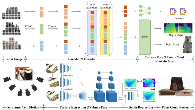 Figure 2. Comparison with Classical MVS. The upper panel illustrates the VGGT framework. It takes multi-view images as input and directly regresses camera poses and dense depth maps through a unified encoder-decoder network. The lower panel depicts the conventional, multi-stage MVS pipeline. This classical approach involves a sequence of discrete steps: first, SfM is used to estimate camera poses and a sparse point cloud; next, a separate depth regression module is employed for each view; finally, these individual depth maps are fused to generate a dense 3D point cloud.