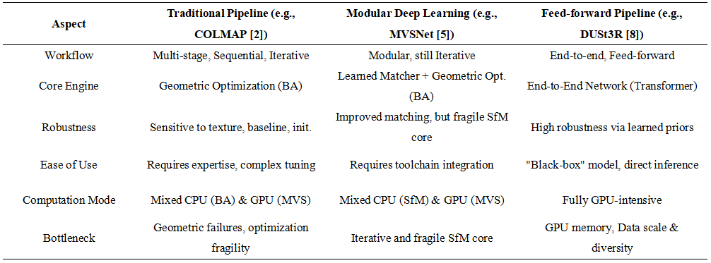 The advent of feed-forward models represents not merely an algorithmic innovation, but a disruptive reconfiguration of the entire 3D reconstruction pipeline. This transformation can be understood through three fundamental shifts: a move from iterative pipelines to holistic inference, a philosophical change from explicit geometric constraints to implicit data-driven priors, and a relocation of developmental and computational bottlenecks. A detailed comparison is shown in Table 2.