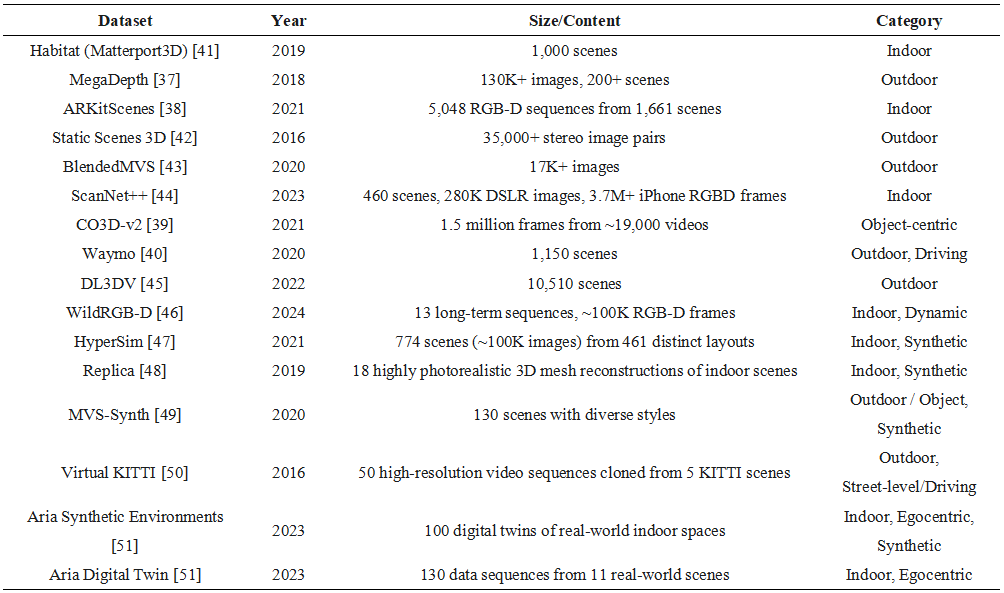 The emergence of feed-forward 3D reconstruction is closely tied to large-scale, diverse datasets. Unlike traditional methods based on explicit geometric principles, these deep learning models encode implicit geometric priors by training on vast data. Consequently, the scale, diversity, and accuracy of the training data directly govern a model's generalization capabilities and final performance. Prominent datasets used for training, such as Habitat [33], MegaDepth [37], ARKitScenes [38], CO3D-v2 [39], and Waymo [40], span diverse conditions, including indoor and outdoor environments, synthetic and real-world captures, and both static and dynamic scenes. This variety provides the necessary data foundation for training robust models equipped to handle real-world perceptual challenges.