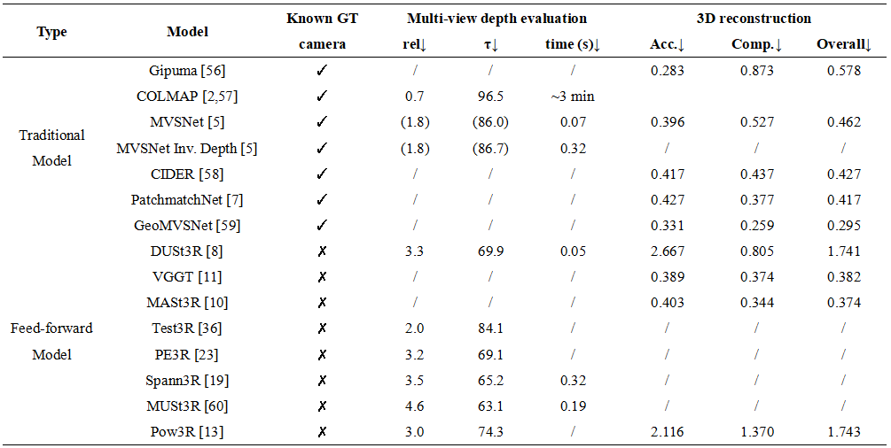 The evaluation of feed-forward models in 3D vision is task-specific, employing distinct benchmarks and metrics to ensure rigorous assessment. For multi-view depth estimation, performance in predicting dense depth maps is benchmarked on datasets such as DTU [52], Tanks and Temples [53], ScanNet [54], and ETH3D [55]. Key metrics include Absolute Relative Error (rel), Inlier Ratios (τ), and the mean distances for Accuracy (Acc) and Completeness (Comp) in mm, which collectively quantify the consistency between predicted and ground-truth depth. Similarly, the quality of 3D reconstruction is evaluated by assessing the geometric fidelity of the final fused model, primarily using the DTU [52] dataset. This evaluation relies on comparing the reconstructed point cloud to a ground-truth scan with three core metrics (in mm): Accuracy, the mean distance from the prediction to the ground-truth; Completeness, the mean distance from the ground-truth to the prediction; and the Overall Score, their average, which is equivalent to the Chamfer distance. The evaluation results for the two tasks are shown in Table 4. It is important to note that feed-forward models (marked with ✗ in the "Known GT camera" column) solve a significantly more challenging problem than traditional methods with known camera poses: they jointly estimate camera poses and dense geometry in an end-to-end manner, without relying on pre-computed pose information. This fundamental difference in task complexity must be considered when interpreting their performance metrics. These standardized protocols facilitate fair model comparison and drive progress in the field.