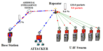 The model (Figure 1) was created using NetCracker software (https://www.netcracker.com/) for simulation attacks on UAV swarm with Repeater. The simulation data based on NetCracker was tested and compared with real data, as described in the books [18,19]. The model contain Base Station transmitting and receiving data; Artificial Intelligence System (AIS); Attacker, which generates interference; intermediate node Repeater, which provides communication between Base Station and UAVs in swarm.