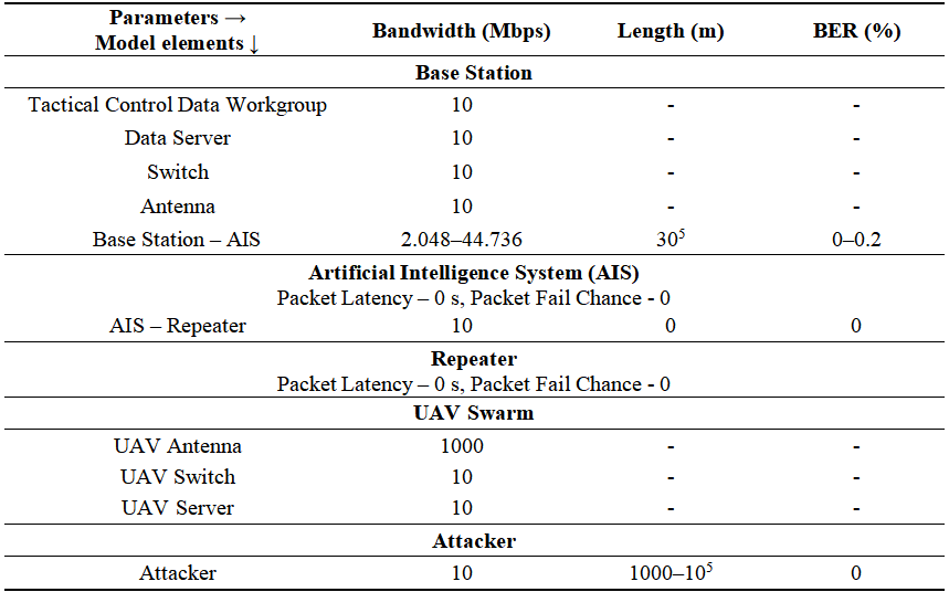 The development of the model and simulation of attacks is motivated by the need to study the resilience of UAV swarm communications to attacks in real-world conditions, where communications are critical for coordination and data transfer. The use of a repeater allows modeling extended communication networks typical of UAV swarms performing joint missions. The inclusion of an attack node reflects real threats actively used in modern conflicts. The model takes into account various communication channel parameters, which allows assessing the impact of attacks on network performance. The use of a repeater reflects a real-world situation, since such platforms are increasingly used to provide long-range communications. The originality of the model lies in the integration of UAV swarm with a repeater containing AIS. Most studies focus on direct UAV-Ground or UAV-Satellite communications, while mesh networks with repeaters remain less studied.