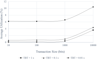 At TBT = 0.1 s: AU begins to gradually grow with increasing transaction size, especially noticeable after 1000 bits. At TS ≈ 10000 bits, AU reaches about 4%, which can still be considered a moderate impact.