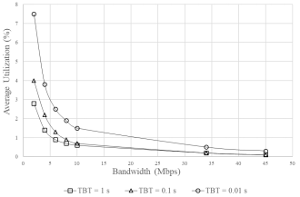At TBT = 1 s: as bandwidth increases, AU tends to decrease, since increasing the channel bandwidth reduces the relative share of the occupied resource; the channel is stable, AU remains low.
