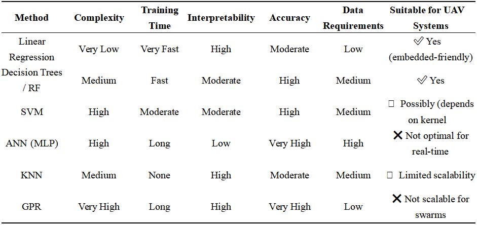 As shown in Table 2, linear regression offers key advantages in embedded or constrained UAV platforms due to its: low computational cost, suitable for real-time systems; interpretability, enabling direct analysis of relationships between inputs and outputs; low data requirements, since polynomial-approximated data can bootstrap the model.