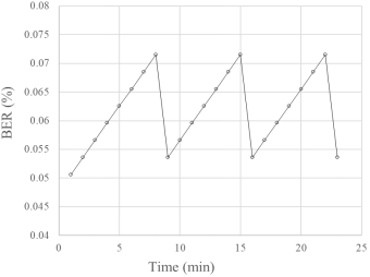 · after reaching the value AU = 4% three times, the data transmission is stopped, and the cognitive correction of the data transmission parameters is displayed in Figures 5 and 6 of the dependencies AU (t) and BER (t).