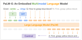 PaLM-E integrates multimodal observations—including textual prompts, visual inputs, and robot state representations—directly into a pre-trained language model. These inputs are encoded as token sequences and processed in an auto-regressive manner, enabling unified reasoning across perception and action domains. To enable robotic execution, PaLM-E operates in conjunction with a low-level language-to-action control policy, which translates textual outputs into executable motor commands.