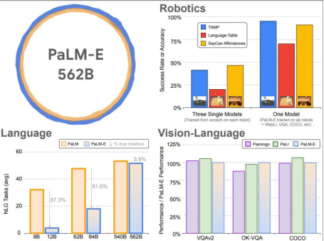 · PaLM-E effectively unifies vision, language, and action across diverse tasks