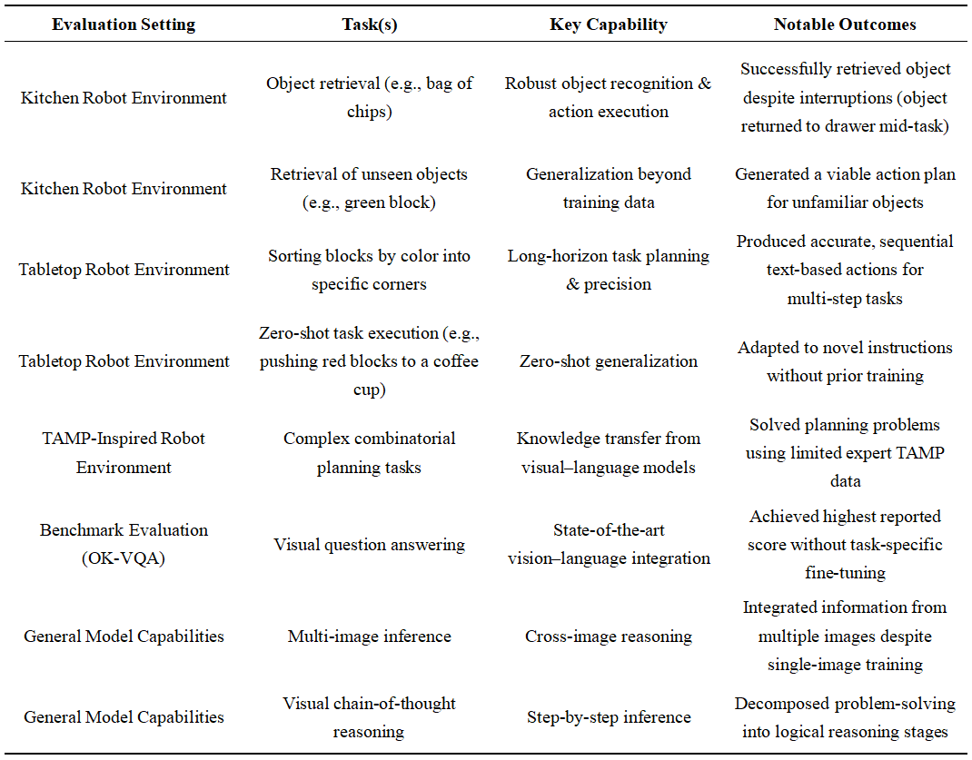 1. A structured evaluation of PaLM-E as an embodied multimodal system, synthesizing evidence from robotic task execution, vision–language benchmarks, and generalization scenarios to highlight both its capabilities and practical limitations.