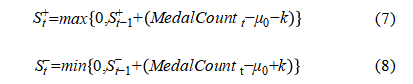 is the positive cumulative sum statistic, reflecting the extent to which medal counts persistently exceed the baseline.