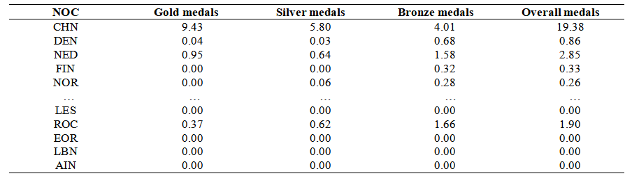 are regression coefficients reflecting the degree of influence each independent variable has on the medal count.