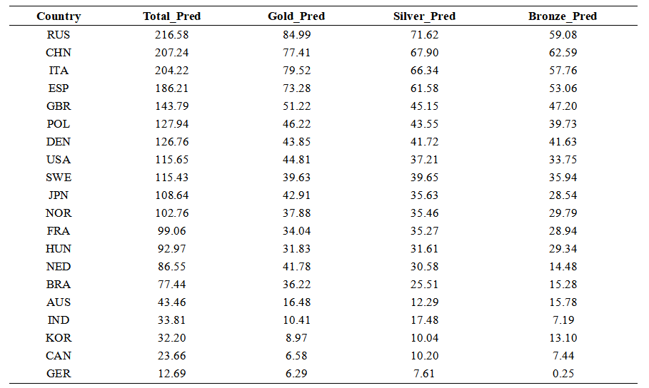 Finally, the model construction and validation are based on historical Summer Olympics data. The applicability of the prediction system and parameter settings to other major sporting events, such as the Winter Olympics or intercontinental multi-sport games, remains to be further validated and adapted.