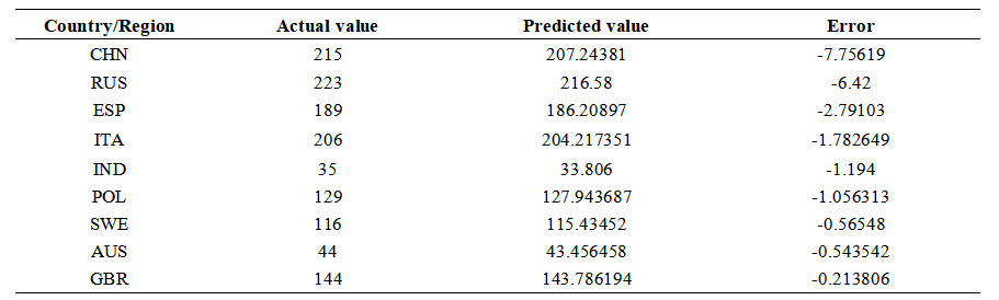 The predictions for each race are built in turn according to the above method, and then summed up and predicted with 95% prediction intervals, resulting in predictions that include the prediction intervals (Table 5 only shows some of the prediction results). Tables 6 and 7 respectively present the prediction results of advancing and retreating countries.