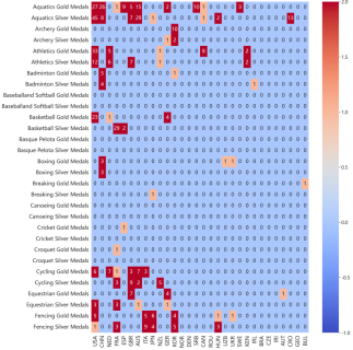 Subsequently, the relationship between different events and their impacts across countries was analyzed using correlation heatmaps (Figure 8). Owing to data sparsity—with most countries winning no medals in the majority of events—an initial filtering step was applied to identify nations with high medal counts. Following the visualization of these countries via heatmaps, correlation analyses were conducted based on randomly selected matching results, which subsequently served as inputs for model fitting.