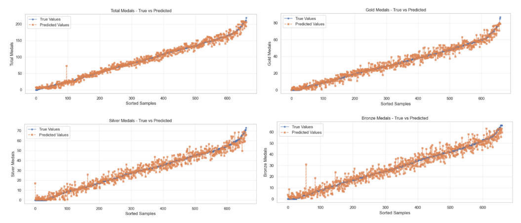 Figure 15. Scatter plot comparison of predicted vs. actual medal counts