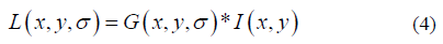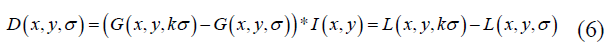 The difference-of-Gaussian Function D (x, y, σ) is calculated from the difference of Gaussians of two scales by a factor k, and given as: