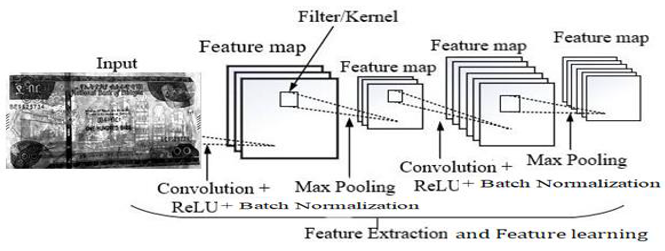 The CNN-based feature extractor is a fourteen-layer convolutional network designed to extract local features from the input image. This architecture utilizes layers that contain learnable kernels (filters), and it incorporates five max-pooling layers, Batch Normalization layers, and the ReLU activation function throughout its structure [45]. We use 3x3 filters in the convolution layer. We use a filter slide from left to right in one direction of the banknote image to extract and learn the various banknote features. At the time of banknote feature extraction, each convolution layer accepts pixel values of the banknote image. Those pixel values are multiplied by 3x3 filter values, which gives the feature map output. It contains learnable patterns to identify the given banknote image.