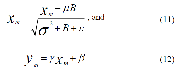 Where ꭓm is the input, and m[1, 2, …, M] Is the mean of the input values, Is the variance of input values, and ɛ is a small positive number. Gama () and Beta () are the two parameters gained in the training process.