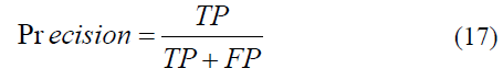 where TP is true positive, FP is false positive, TN is true negative, and FN is false negative. Precision represents the proportion of correctly identified positive instances relative to all labeled instances as positive by the model. Using TP (true positives) and FP (false positives), this percentage is calculated as follows:
