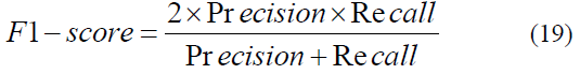 The F1-score serves as the harmonic mean of precision and recall, providing a balanced assessment of a model's performance for a specific positive class. Rather than a simple arithmetic average, this metric penalizes extreme values, ensuring that a high score is only achieved when both precision and recall are robust. This makes the F1-score particularly valuable in scenarios involving imbalanced datasets, where focusing on a single metric might lead to a misleading evaluation of the system's predictive power. The consolidated relationship between these two components is mathematically represented in Equation 19.