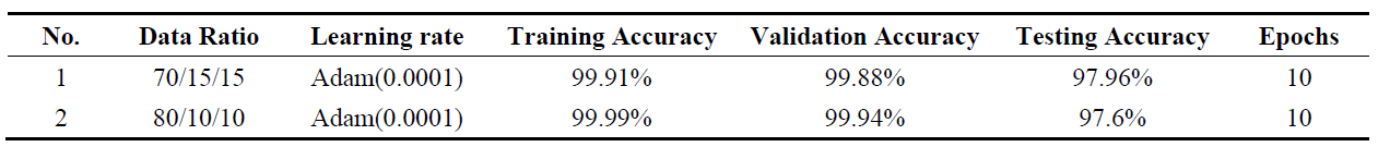 We evaluated the proposed model with different learning rates(0.01,0.001,0.0001) and two train-test split ratios(80/10/10 and 70/15/15) that can affect the performance of the network model. As shown in Table 4, when we use the 80/10/10 dataset proportion of training, validation, and testing, we obtain high performance on the loss value, training accuracy, and validation accuracy value, so we use the training data to increase the performance of the CNN model. Besides this, in the 70/15/15 dataset ratio, the training data is smaller, and the test dataset is higher compared to the 80/10/10 dataset ratio. So, the performance we obtained on the 70/15/15 dataset ratio is smaller in the loss value, the training accuracy, and the validation accuracy than the 80/10/10 dataset ratio. Our experimental result has shown that increasing the training dataset. It is possible to train, validate, and test performance.