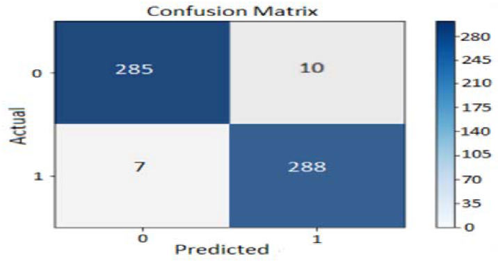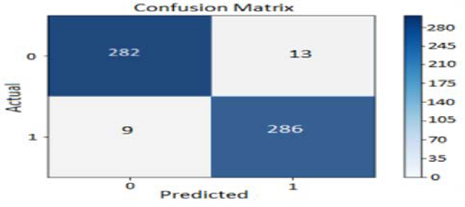 As illustrated by the confusion matrix in Figure 9, the proposed CNN model, utilizing an 80/10/10 data split, demonstrated a high level of accuracy on the testing dataset. Out of the 590 banknote images used for testing—comprising an equal number of 295 real and 295 fake banknotes—the model correctly identified 576. This resulted in only 14 images being misidentified, confirming the model's effectiveness in distinguishing between real and counterfeit currency.