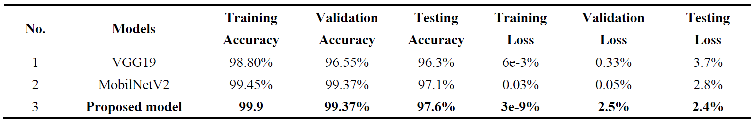 The proposed detection and classification model is better than the previous CNN model's accuracy. It is characterized as (i) replacing the Soft-Max ReLu activation functions with Sigmoid (binary classification and MobileNetV2 design for multi-class problems). (ii) Detection parameter counts fewer compared to other pre-trained CNN models. (iii) Implementing a feature fusion technique. (iv) Down-sampling techniques, and (v) The proposed model, designed with our custom dataset in mind, demonstrates improved performance compared to other pre-trained CNN models. The proposed model automatically determines the optimal number of epochs using an early stopping mechanism. Furthermore, the training process is designed to halt upon the detection of new features within the dataset. For the pre-trained model, the number of training epochs was set to 10, which may be insufficient to fully leverage the feature extraction capabilities of the pre-trained CNN architecture. Additionally, while the proposed model employs an optimal learning rate determined through a trial-and-error approach (as shown in Table 5), the pre-trained CNN model utilizes a similar learning rate. This discrepancy in learning rate optimization may have adversely impacted the performance of the pre-trained model, as evident in Table 6.