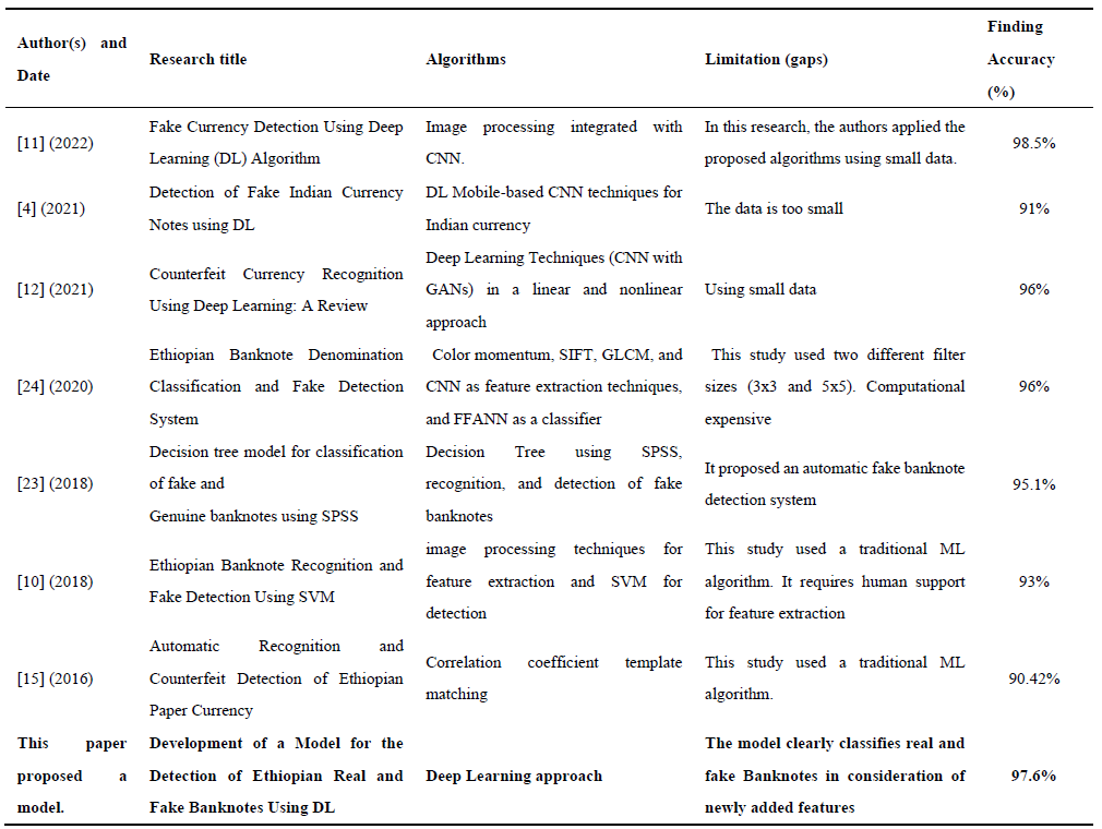 This study is driven by a critical examination of the motives and existing research gaps within the field of counterfeit currency identification. As detailed in the second and third paragraphs of Section 1, a significant void exists regarding detection mechanisms for newly introduced banknote designs and the specific evolution of algorithms used in prior literature. Our analysis, summarized in Table 6, highlights several recurring limitations in previous works, most notably restricted dataset sizes, high computational complexity, and a failure to account for emerging security features in modern detection methods. To address these shortcomings, this paper proposes a novel detection framework for counterfeit banknotes leveraging advanced deep learning architectures designed to overcome the constraints of traditional methodologies.