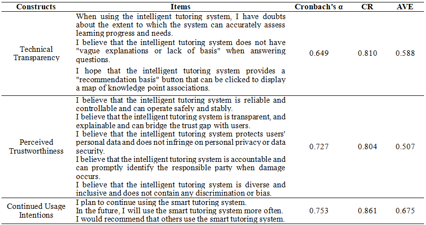 By examining these questions through quantitative methods, this research aims to clarify the psychological mechanisms connecting transparency, trust, and sustained engagement in intelligent learning environments. In doing so, it provides empirical evidence for designing trustworthy educational technologies that not only encourage continuous system use but also contribute to the cultivation of innovation literacy among university students. The findings are expected to inform both theoretical discourse and institutional practice, offering insights for policymakers, educators, and developers seeking to align intelligent tutoring systems with the overarching goals of innovation-driven higher-education reform.