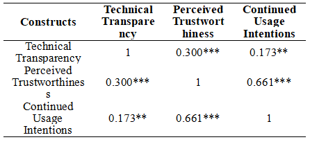 To examine the linear relationships among the key variables, Pearson correlation coefficients were calculated. The analysis reveals significant positive correlations among Transparency, Trustworthiness, and Intentions, with all coefficients achieving statistical significance at the conventional level.