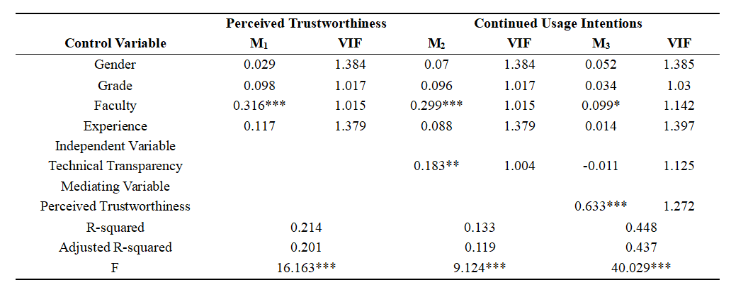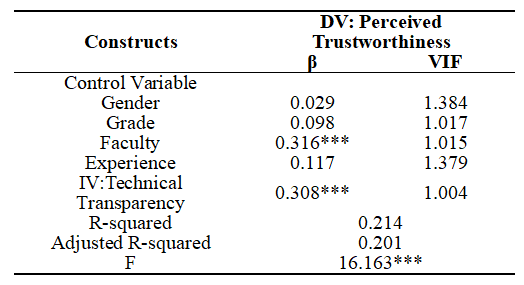 To empirically test this relationship,a regression analysis was conducted with perceived trustworthiness as the dependent variable and gender, grade, faculty, and prior experience included as control variables. As shown in Table 4, the overall model is statistically significant (F=16.163), explaining 21.4% of the variance in perceived trustworthiness (R²=0.214; Adjusted R²=0.201). Among the control factors, only faculty exhibits a significant effect (β=0.316, p<.001), while the remaining demographic variables show no meaningful influence.