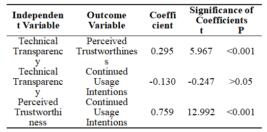 Overall, the correlations among the three variables align with the theoretical expectations of the proposed model. The significant positive relationships indicate that technical transparency not only directly influences user intentions but is also closely associated with users' trust perceptions, forming a theoretical basis for testing the mediating role of trustworthiness in H4.