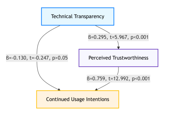 (2) Mechanistic Ambiguity. Although transparency is widely acknowledged as a precursor to trust, the causal processes through which technical transparency influences perceived trustworthiness and continued engagement remain insufficiently validated. Empirical evidence confirming the mediating function of perceived trustworthiness is especially scarce in educational technology research, leaving theoretical propositions under-tested and potentially context-dependent.
