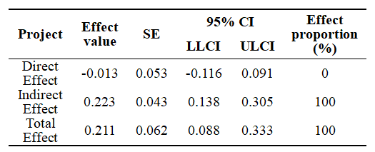 Bootstrap results for effect decomposition revealed (Table 8): The direct effect of TT on CUI was -0.013 (SE = 0.0526), with a 95% confidence interval (CI) of [-0.1164, 0.0905] (including 0, thus non-significant). The indirect effect (TT→PT→CUI) was 0.223 (SE = 0.0426), with a 95% CI of [0.1376, 0.3049] (excluding 0, thus significant). The total effect of TT on CUI was 0.211 (SE = 0.0621, 95% CI = [0.0882, 0.3328], significant).