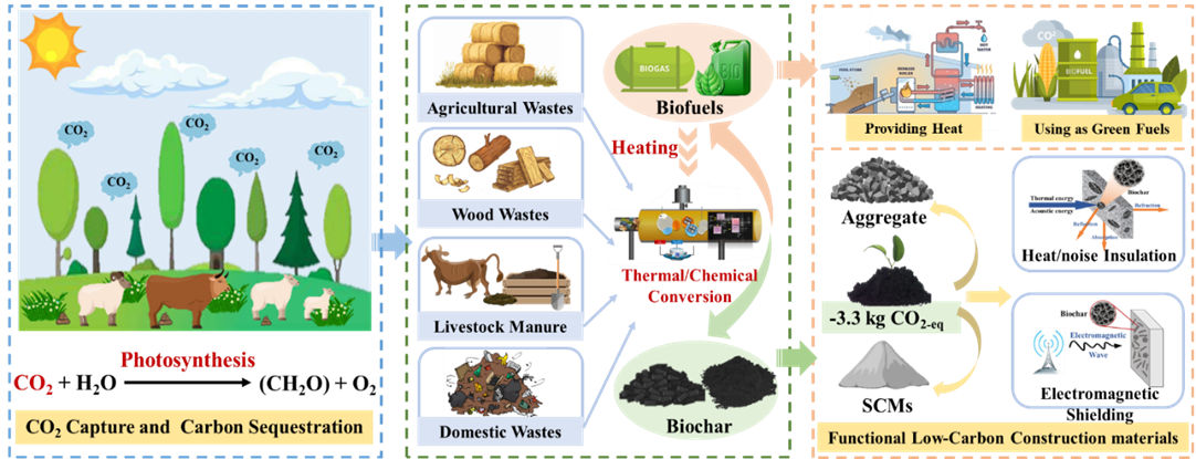 Construction sector is one of the largest contributors of global carbon emissions. To achieve carbon neutrality, it is urgent to promote the low-carbon transformation of the construction sector. Biochar is a typical carbon-negative material that can be used as a supplementary cementitious material or aggregate to reduce the carbon footprint of construction materials and promote cement hydration through the internal curing effect and filler effect. Biochar with a porous structure can promote the diffusion of carbon dioxide (CO2) in concrete and improve carbonation efficiency. Moreover, the porous structure and high conductivity of biochar can make construction materials have special functions including thermal insulation, noise reduction and electromagnetic shielding. Therefore, recycling biochar into concrete is a promising approach to reduce the carbon footprint and enhance the performance of construction materials.